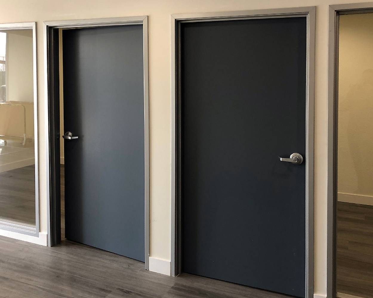 Metal doors are built with durable steel or galvanized steel, often reinforced with insulated or specialty cores to boost strength, fire protection, and energy efficiency. They’re designed specifically for commercial use, making them capable of handling the daily wear that comes with high-traffic areas.