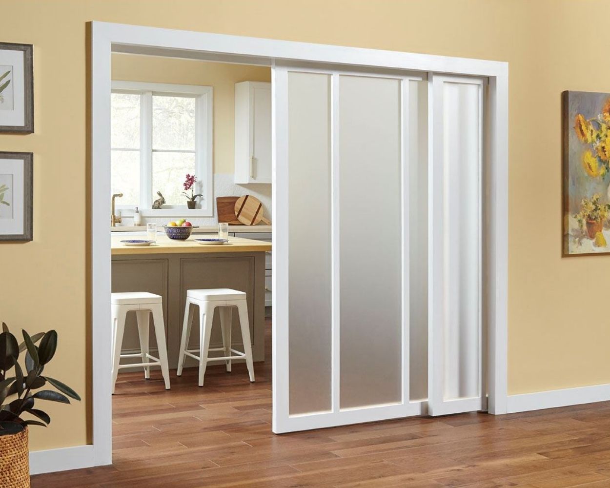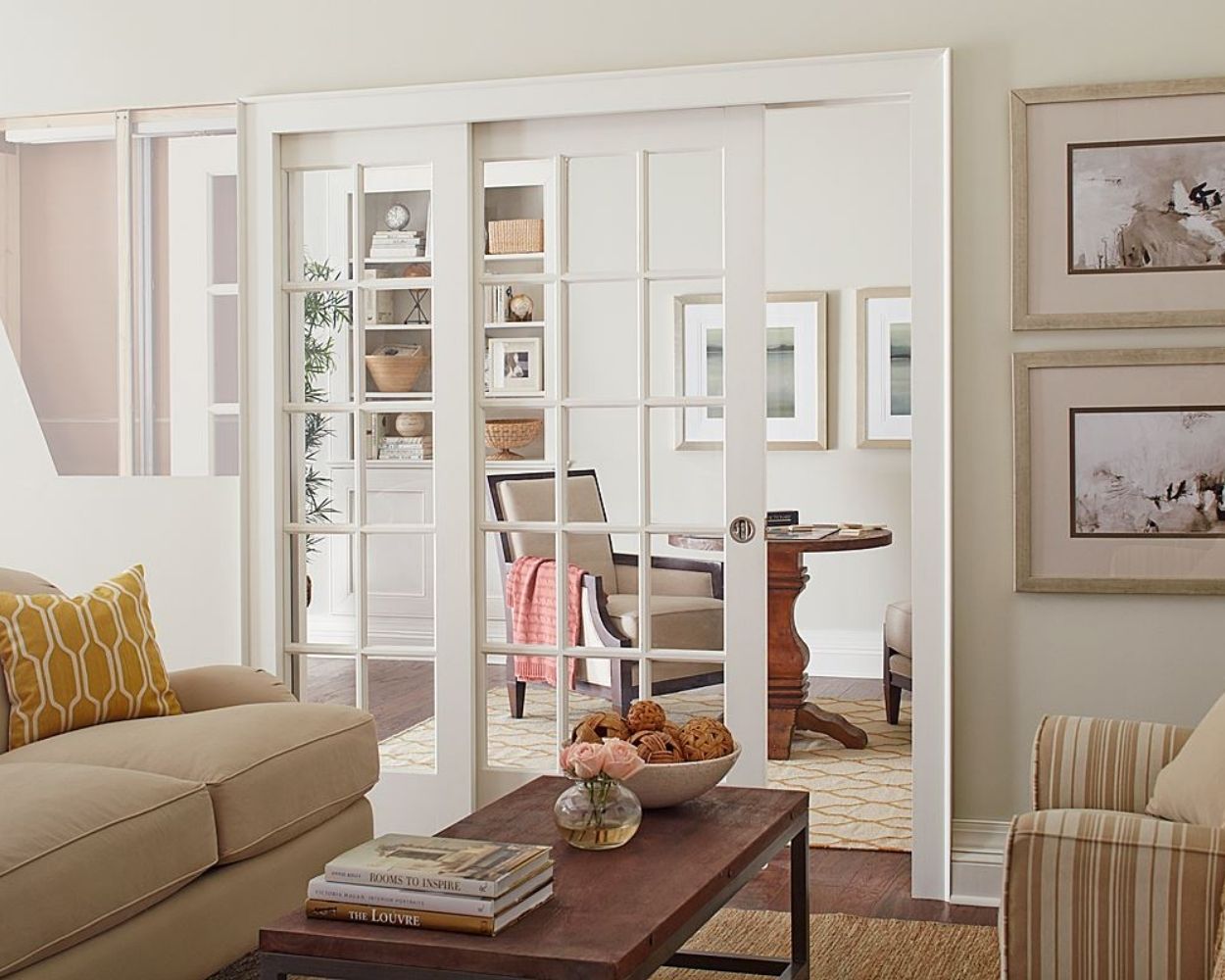 Pocket doors are sliding doors that disappear into a hidden wall cavity when opened. Instead of taking up space like a traditional hinged door, the panel glides along a track inside the wall, allowing for a seamless transition between rooms.