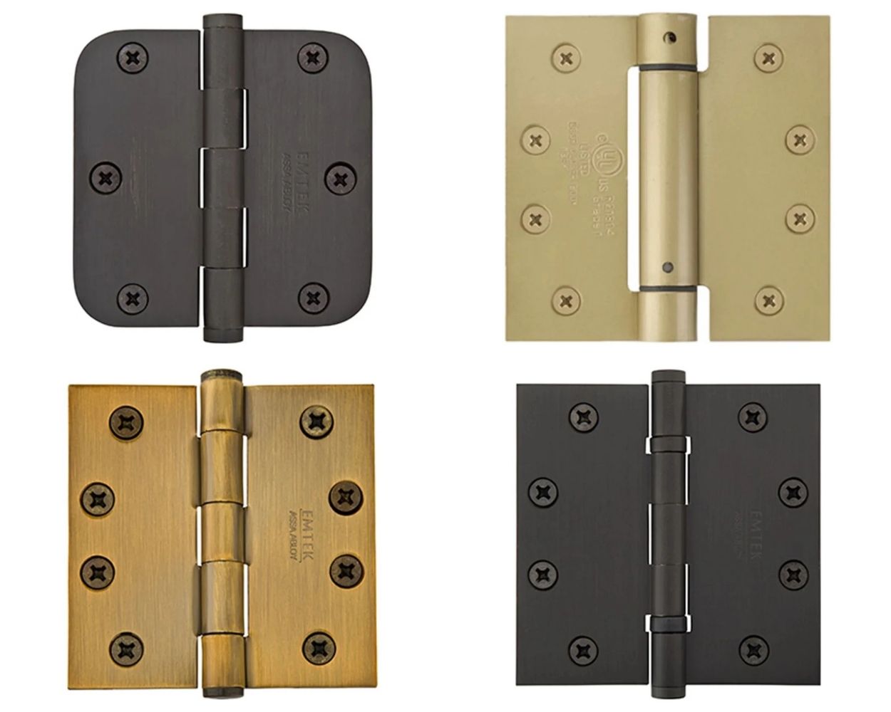 Common options include: butt, ball-bearing, concealed, and spring. Each has different applications depending on the weight and function of the door.